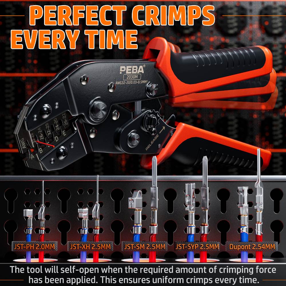 PROFI CRIMPWERKZEUG - Crimpwerkzeuge verfügen über effiziente Ratschenmechanismen und professionelle Crimpeinsätze. Mit einstellbarer Crimpkraft und Schnellspannhebel. Backen werden mit Drahterodieren bearbeitet, genauer als normale Gussformen. HERVORRAGENDE QUALITÄT - Speziell angefertigt Arbeitssparende Backen, liegt gut in der Hand, zum Verpressen in der Lage Kabelquerschnitte 0,03-0,5mm² ( AWG32-20). Dank verschiedener Größen ist diese Crimpzange sehr flexibel einsetzbar, anstatt vier verschiedene mitzunehmen. EIN ECHTER ALLROUNDER - Crimpzange ist in der Lage verschiedene Arten zu verpressen, z.B. JST-PH 2,0, Dupont 2,54 mm, JST(XH/SYP/SM 2,5mm,PH 2,0mm,VH 3,96mm), KF2510, Molex (KK 254 + Micro-Fit 3,0 mm), AMP/TE EI-Serie, D-SUB und Futaba Servo Anschluss usw. Bei PEBA kannst du dich stets auf absolute Topqualität verlassen. BOMBENFESTE VERBINDUNGEN - Inkl. Crimpzange + Abisolierzange + 28 unterschiedlichen Dupont und JST -Typen, bleibt kein Crimp-Projekt unvollendet. Perfekt für manuelles DIY, 3D-Druckgerät und Haushaltskomponenten usw. In diesem professionellen Set ist für jeden immer der richtige und passende Verbindungsstecker dabei. PEBA PRAKTISCHEN BOX - Das Set ist sehr gut sortiert. Jede Steckergrösse hat ihren Platz und auch die Zange passt problemlos in den Box. Im Deckel liegt ein Schaublatt, womit sich schnell erkennen lässt, welche Stecker für welchen grösse benötigt wird und wo diese hier zu finden ist - einfacher geht es nicht!