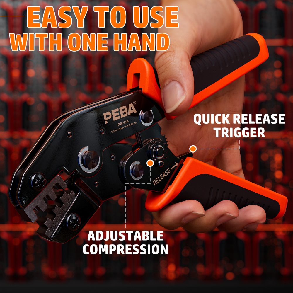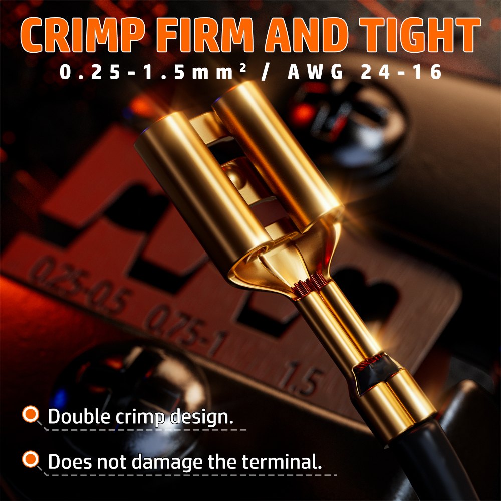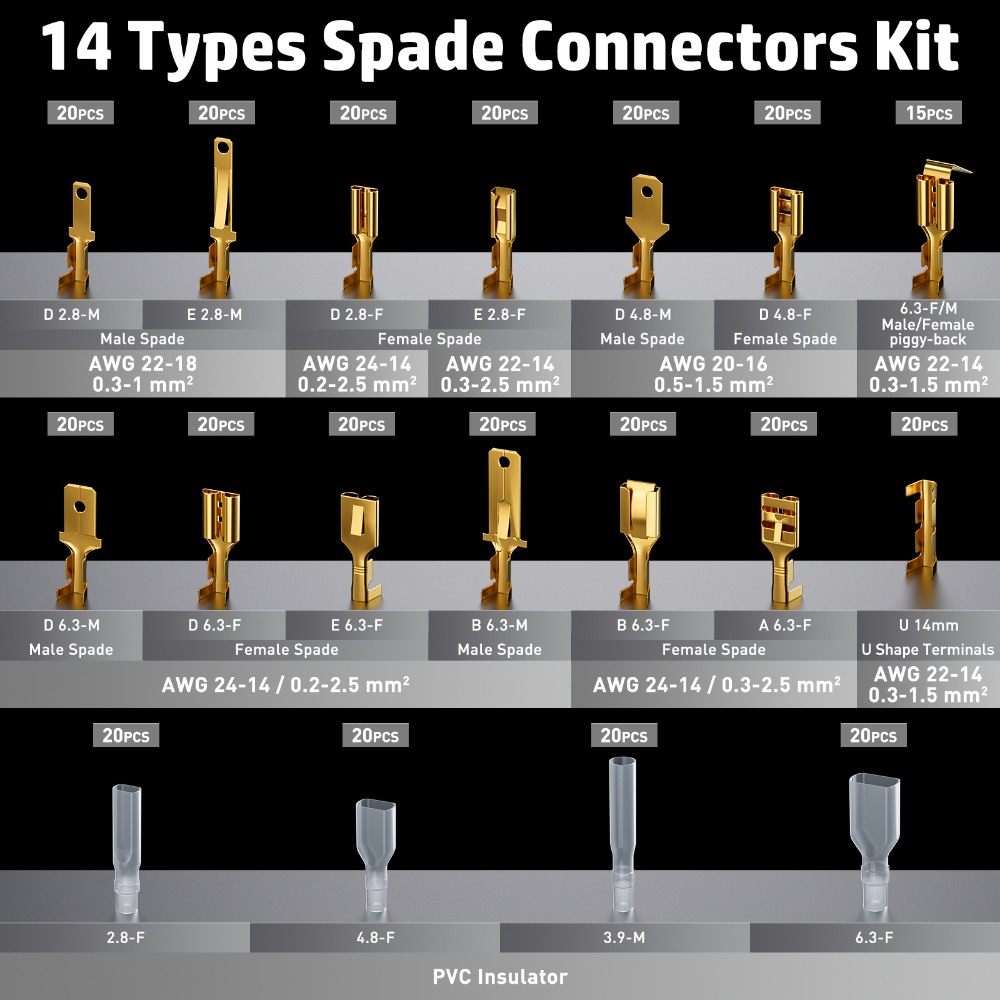 Wire Crimper: The crimper tool is designed to crimp 24-14 AWG non-insulated open barrels, OEM-style terminals, and wire splices. It provides the perfect crimping service for the open terminal connector you buy (You may be lucky enough to receive a red storage box.) Precision Crimping: The wire crimper features an automatic adjustment ratchet mechanism and an adjustable locking device for precision. It has dual crimping stations that simultaneously crimp the wire and insulation in one operation All-rounder: Thanks to the Three different jaw sizes, can be applied to crimping 2.8mm, 3.5mm, 3.9mm, 4.8mm, and 6.3mm pitch open barrel terminals from Molex Standard .093"/MX150/MLX Crimp Terminal, AMP - TE CONNECTIVITY Mate-n-Lok/FASTON Connector, etc Wiring Safety: Male and female spade terminals are made of high-quality tin-plated red copper, whose surfaces are plated with tin which ensures good conductivity and corrosion resistance. Use with matching crimp terminals for safe use Brass Terminals: Male/female spade connectors can easily connect and pull apart. Kits include Non-Insulated Piggyback Connectors - Butt Connectors, and male-female spade connectors of sizes:0.110"/0.187"/0.250", different sizes can meet your various needs Application Projects: The wire crimping tool spade bullet connectors kit can be widely used for home appliances, auto, audio systems for battery or rocker switch quick connecting/disconnecting, motorcycle, scooter, auto, car, truck, boat, Arduino, 3D printer, PCB, jumper wire and other electronic DIY projects, etc