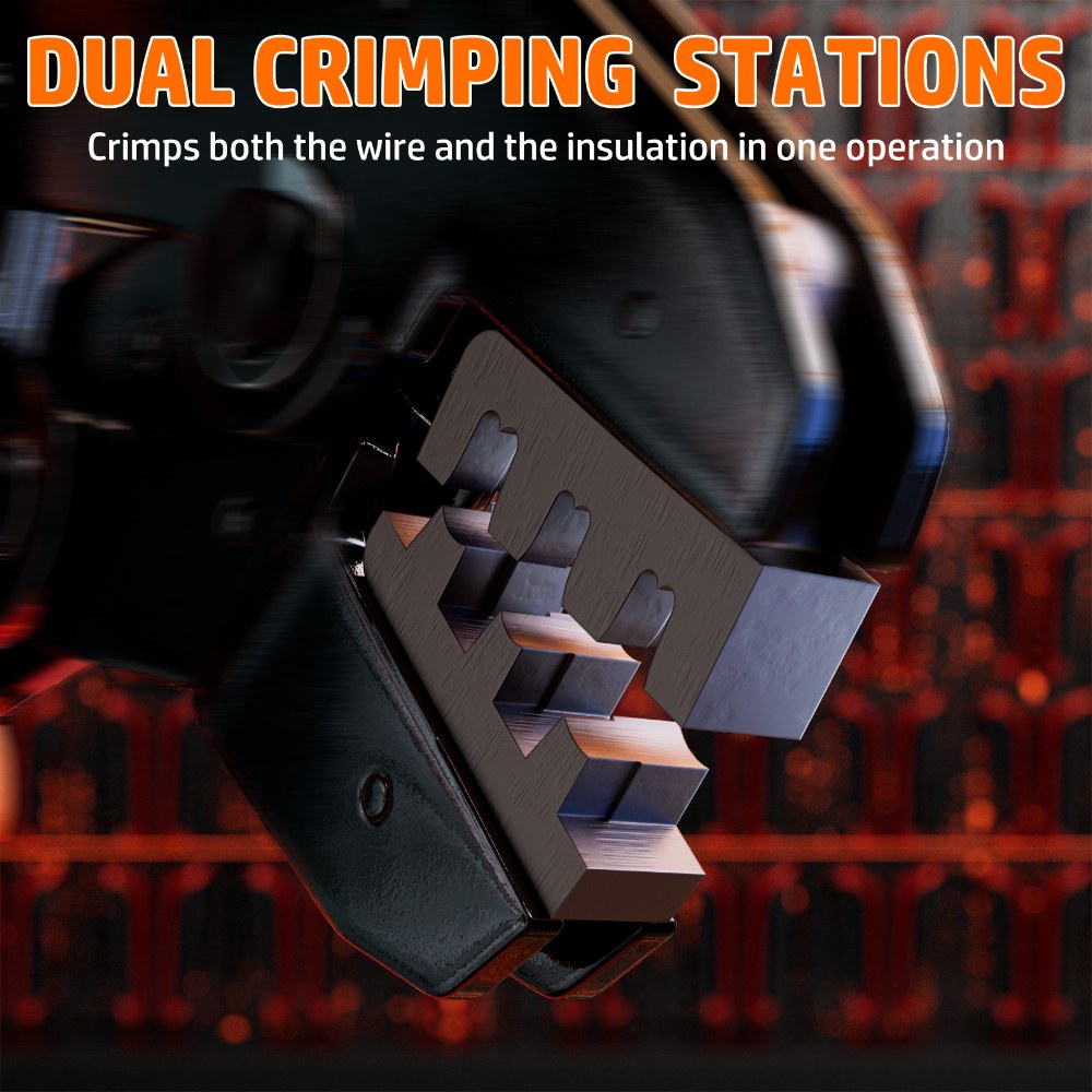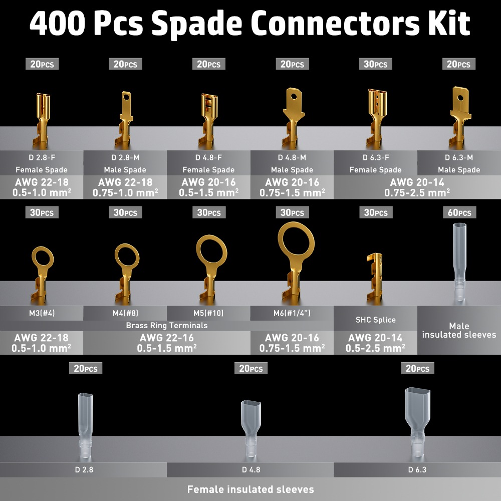 Wire Crimper: The crimper tool is designed to crimp 24-14 AWG non-insulated open barrels, OEM-style terminals, and wire splices. It provides the perfect crimping service for the open terminal connector you buy. Precision Crimping: The wire crimper features an automatic adjustment ratchet mechanism and an adjustable locking device for precision. It has a dual crimping station that crimps both the wire and the insulation in one operation All-rounder: Thanks to the Three different jaw sizes, can be applied to crimping 2.8mm, 3.5mm, 3.9mm, 4.8mm, and 6.3mm pitch open barrel terminals from Molex Standard .093"/MX150/MLX Crimp Terminal, AMP - TE CONNECTIVITY Mate-n-Lok/FASTON Connector, etc. Wiring Safety: Male and female spade terminals are made of high-quality tin-plated red copper, whose surfaces are plated with tin which ensures good conductivity and corrosion resistance. Use with matching crimp terminals for safe use. Brass Terminals: Male/female spade connectors can easily connect and pull apart. Kits include Non-Insulated Splice Connectors, Ring Connectors, and 0.110"/0.187"/0.250" male-female spade connectors, different sizes can meet your various needs. Application Projects: The wire crimping tool spade bullet connectors kit can be widely used for home appliances, auto, audio systems for battery or rocker switch quick connecting/disconnecting, motorcycle, scooter, auto, car, truck, boat, Arduino, 3D printer, PCB, jumper wire and other electronic DIY projects, etc.